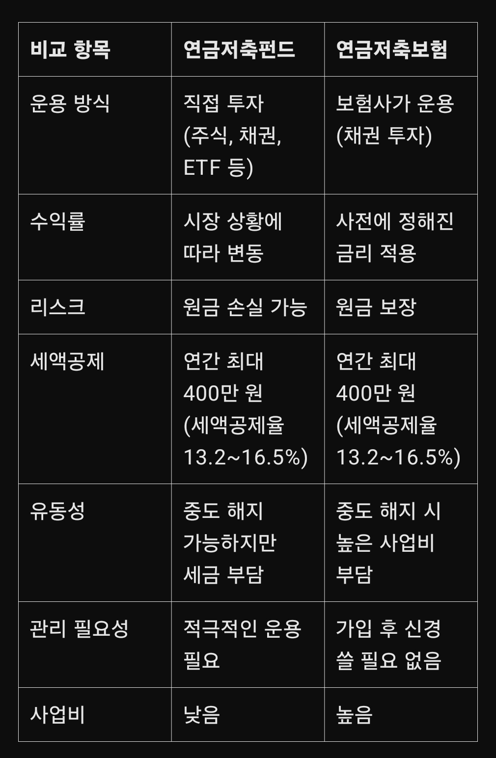 ✔️ 리스크를 줄이고 싶다면? → 연금저축펀드와 보험을 적절히 혼합하여 가입하는 것도 방법